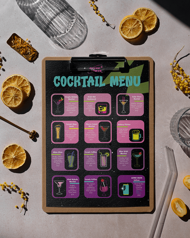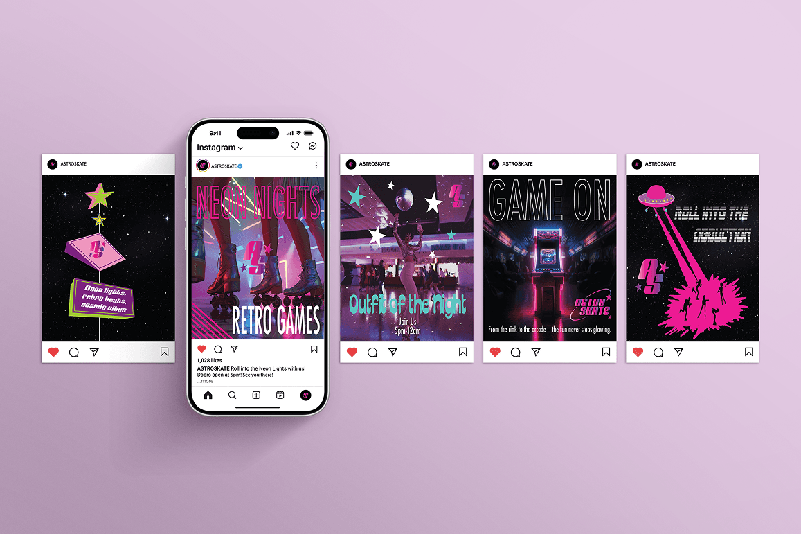 The visual identity for Astro Skate is rooted in 80s nostalgia, energy, and bold expression. The goal was to capture the neon-lit atmosphere of classic roller rinks while introducing a slightly edgier, punk-inspired twist.