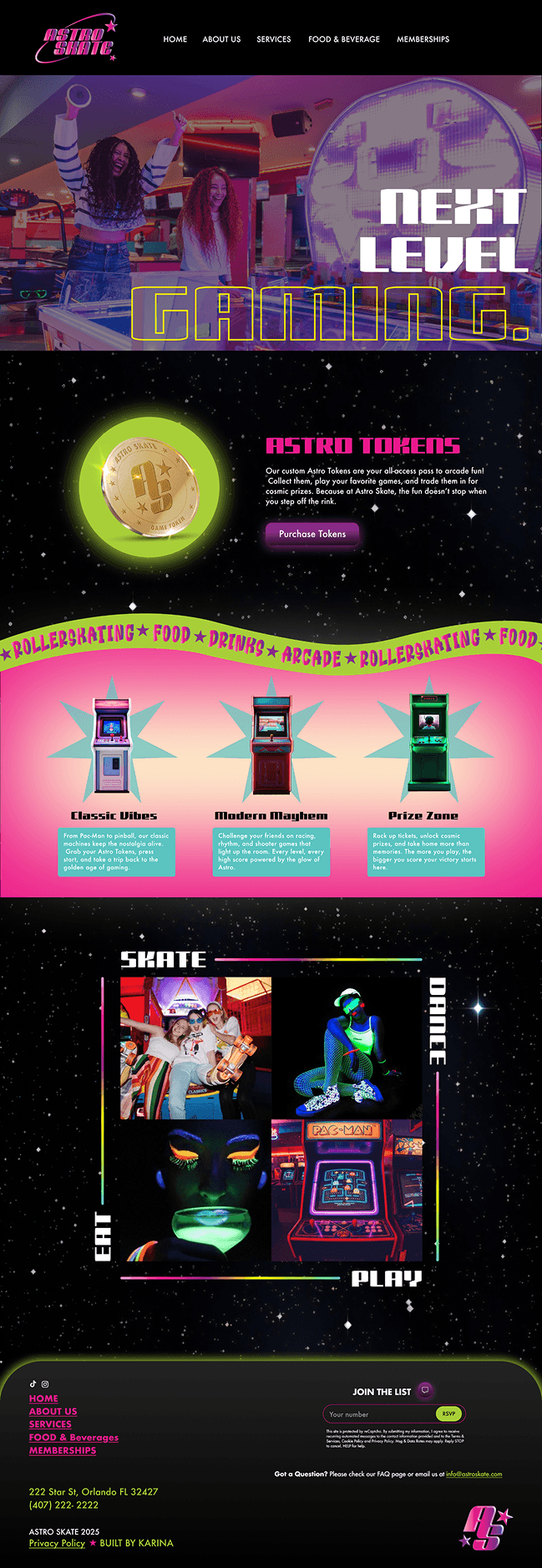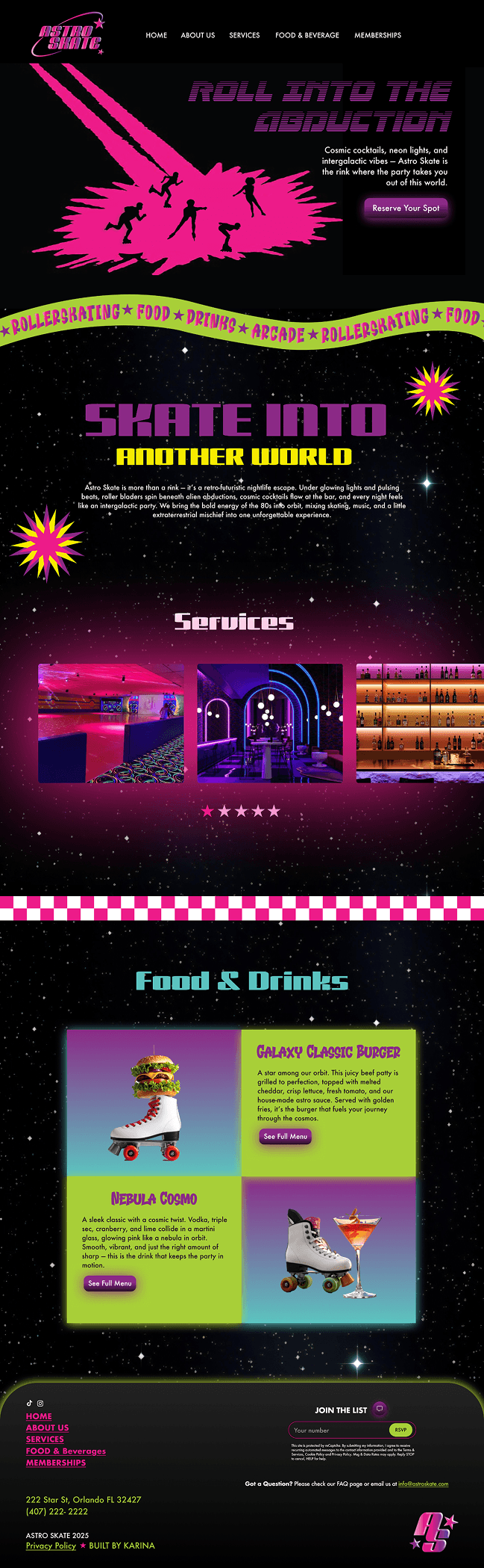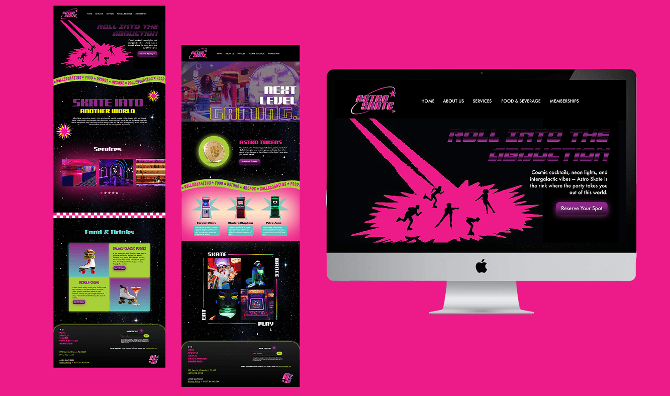 The Astro Skate website was designed to capture the energy and atmosphere of the rink through a more immersive digital experience. Instead of a minimal or restrained layout, the design leans into bold visuals, color, and movement to reflect the excitement of the space. Content is structured to feel dynamic and engaging, guiding users through events, sessions, and key information while maintaining a clear flow. The goal was to create an experience that feels just as lively and expressive online as it does in person.